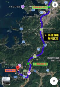 ・松山高速自動車道 津島高田ICを下車後、出船・岩松港まで5分少々の近さです♪